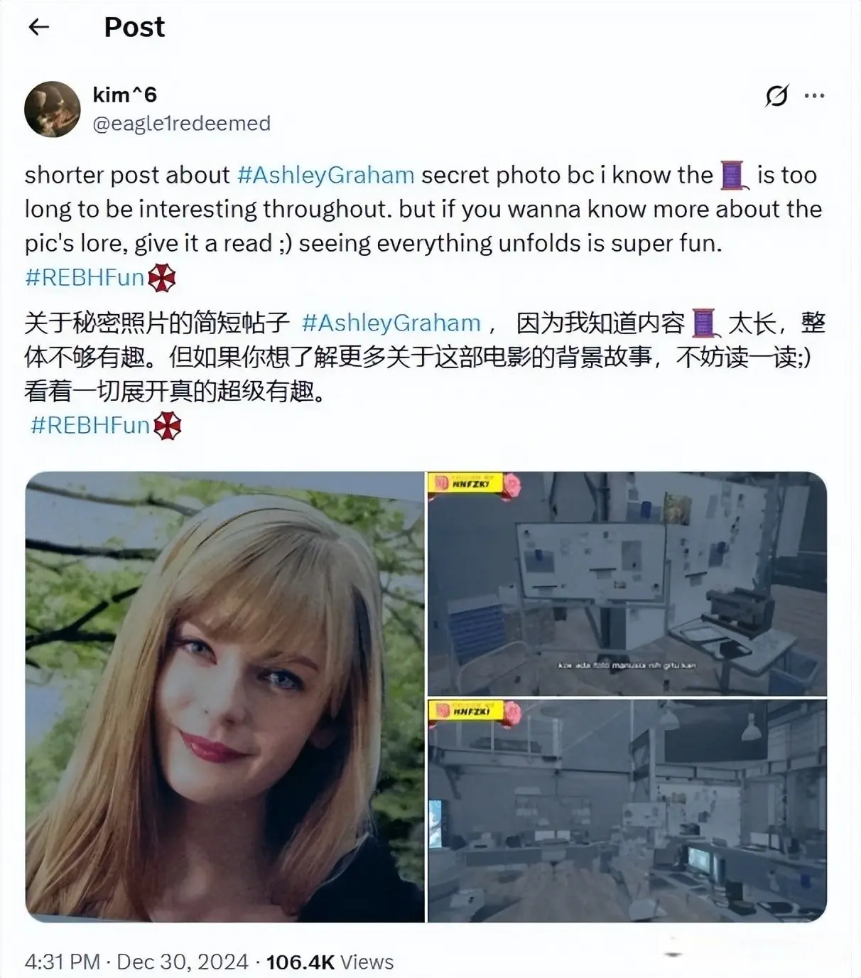 外网上一个玩家之前翻出了压箱底的料:2023年《生化危机4重制版》发布前的电锯试玩版里,哈尼根办公室的桌上摆着一张中年女性的照片,需要自由摄像机才能看到。等正式版上线后这张照片被删得干干净净,而根据他的说法,这张照片就是40岁的艾什莉·格拉汉姆。再结合《生化危机9》里里昂已经结婚的设定,那么答案就呼之欲出了。也就是说,卡普空可能早在三年前就埋好了这个伏笔,只是所有人当时都没当回事。